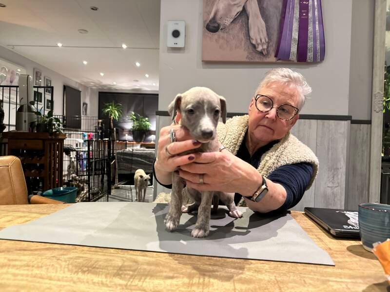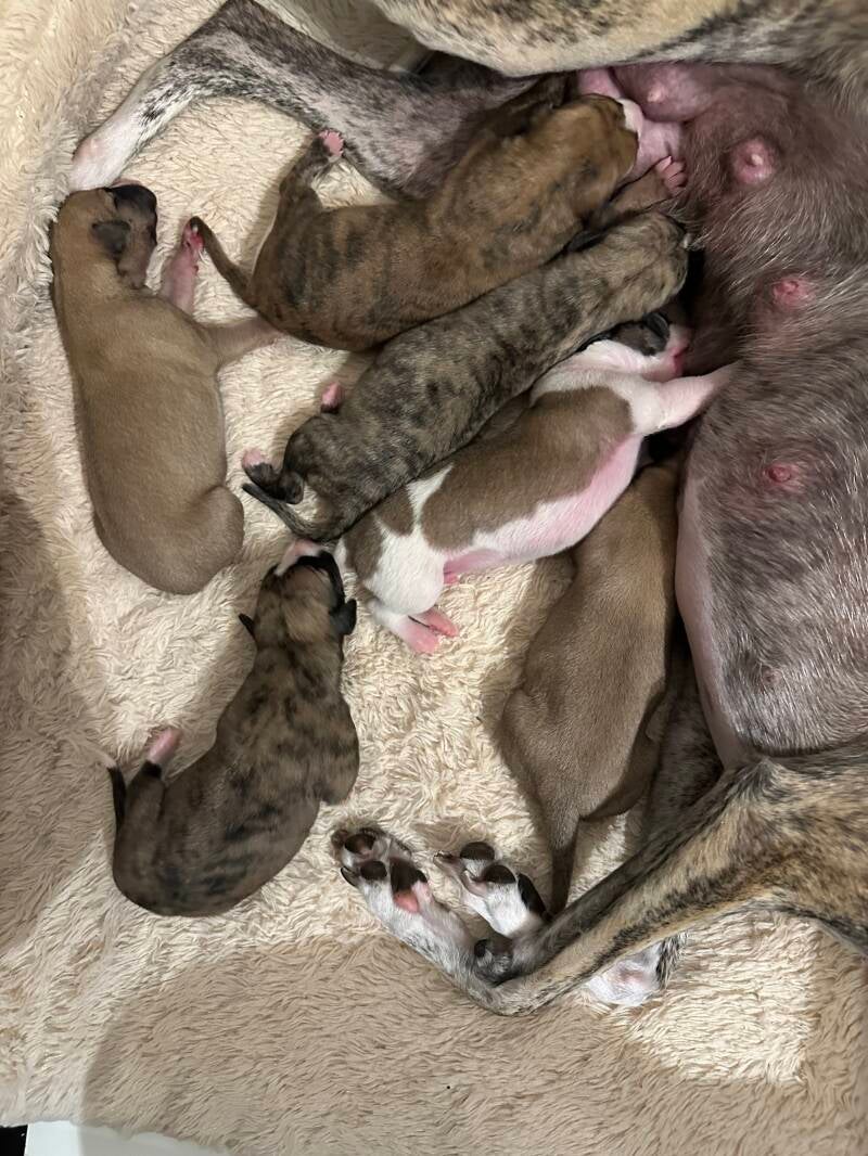 op zaterdag 14 september 2024 zijn 6 reuen geboren, 2 fawn, 3 brindles en 1 parti color. Mamma Jazz is super trots op haar puppies. De pups groeien als kool!